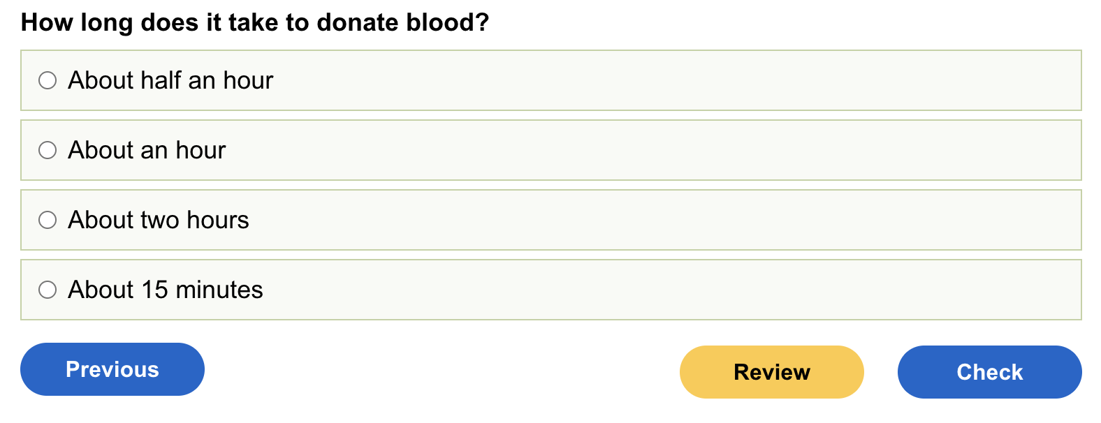 4. How long does it take to donate blood? (No, they won’t tell you if it includes waiting time, recovery time, or depending on your personal blood flow rate.)