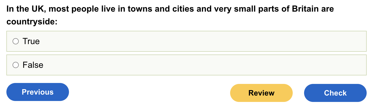 9. In the UK, most people live in towns and cities and very small parts of Britain are countryside. (Oddly phrased double-barrelled question, of which one part seems to be true and the other false.)
